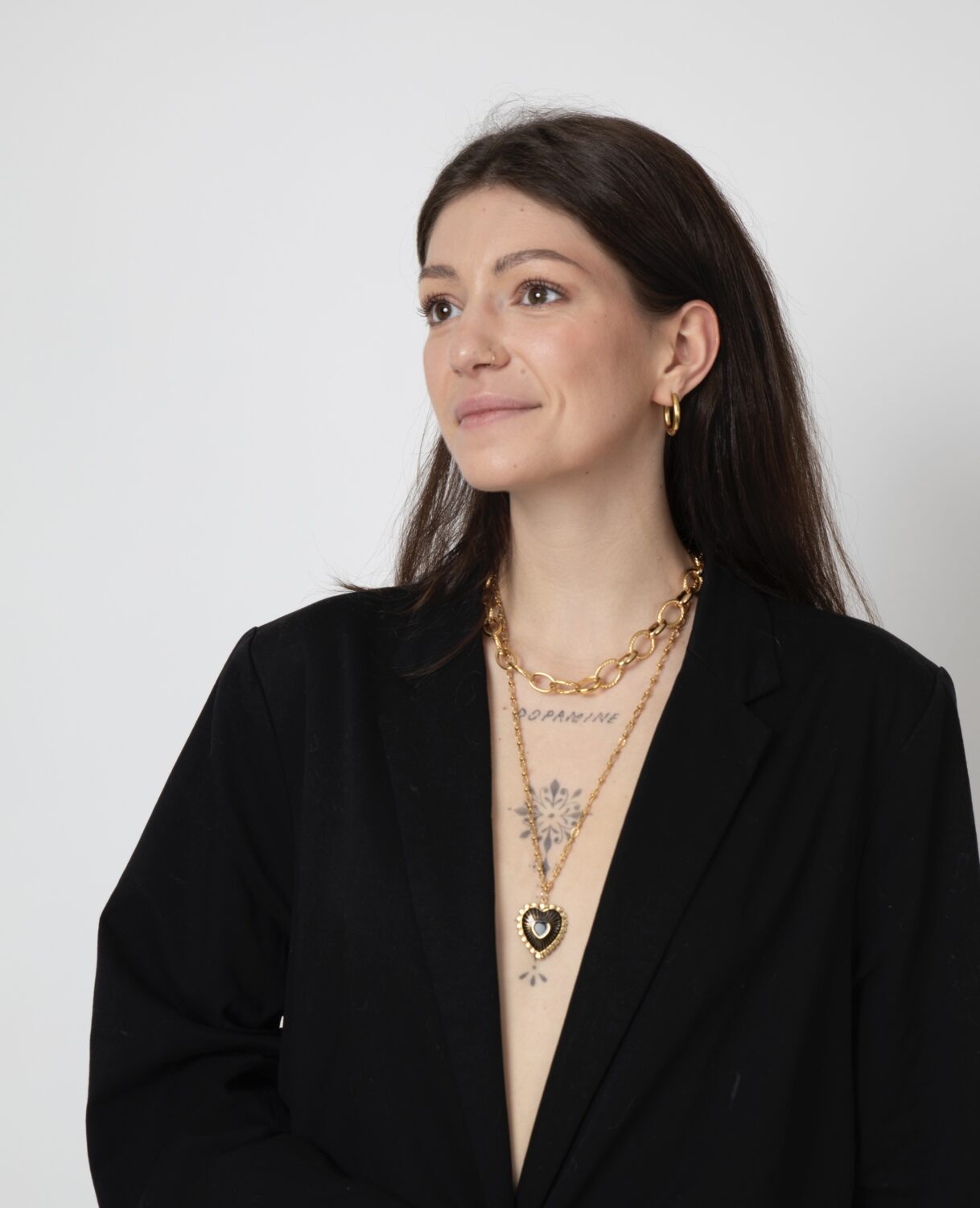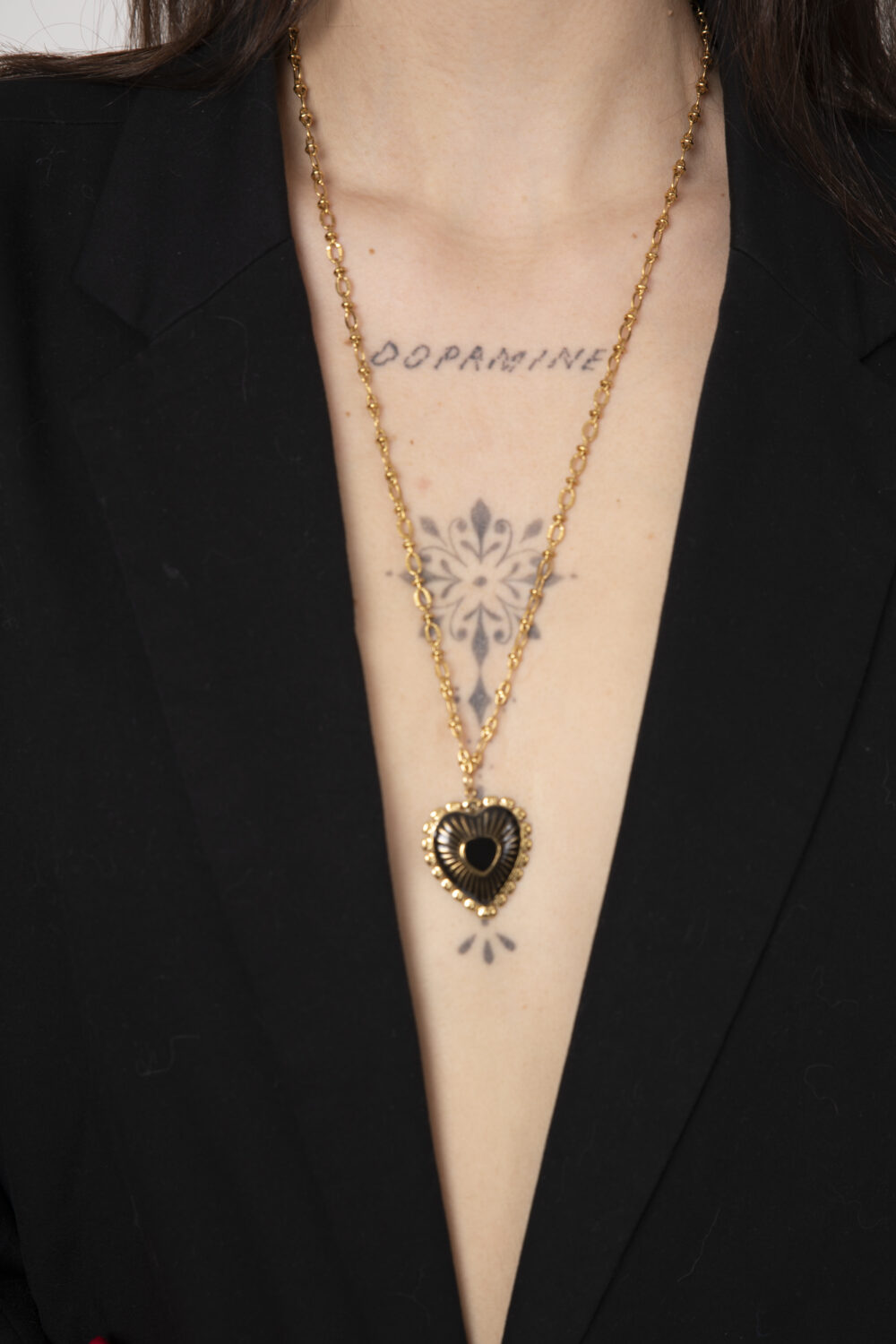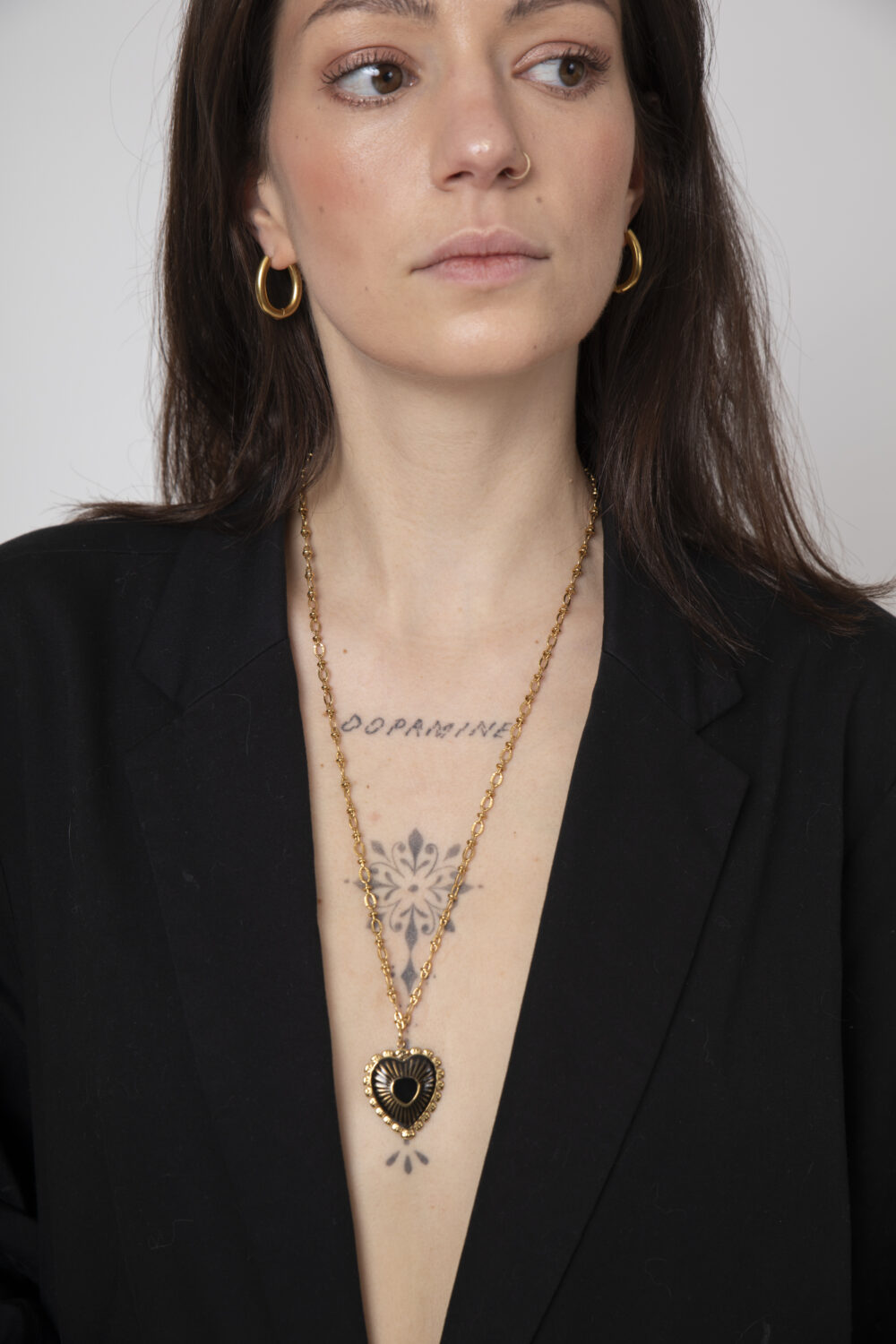 Sautoir Cuore Nero en acier inoxydable. Une chaine à mailles fines, parfait en statement piece ou pour accompagner un bijoux plus épais, comme le London par exemple.