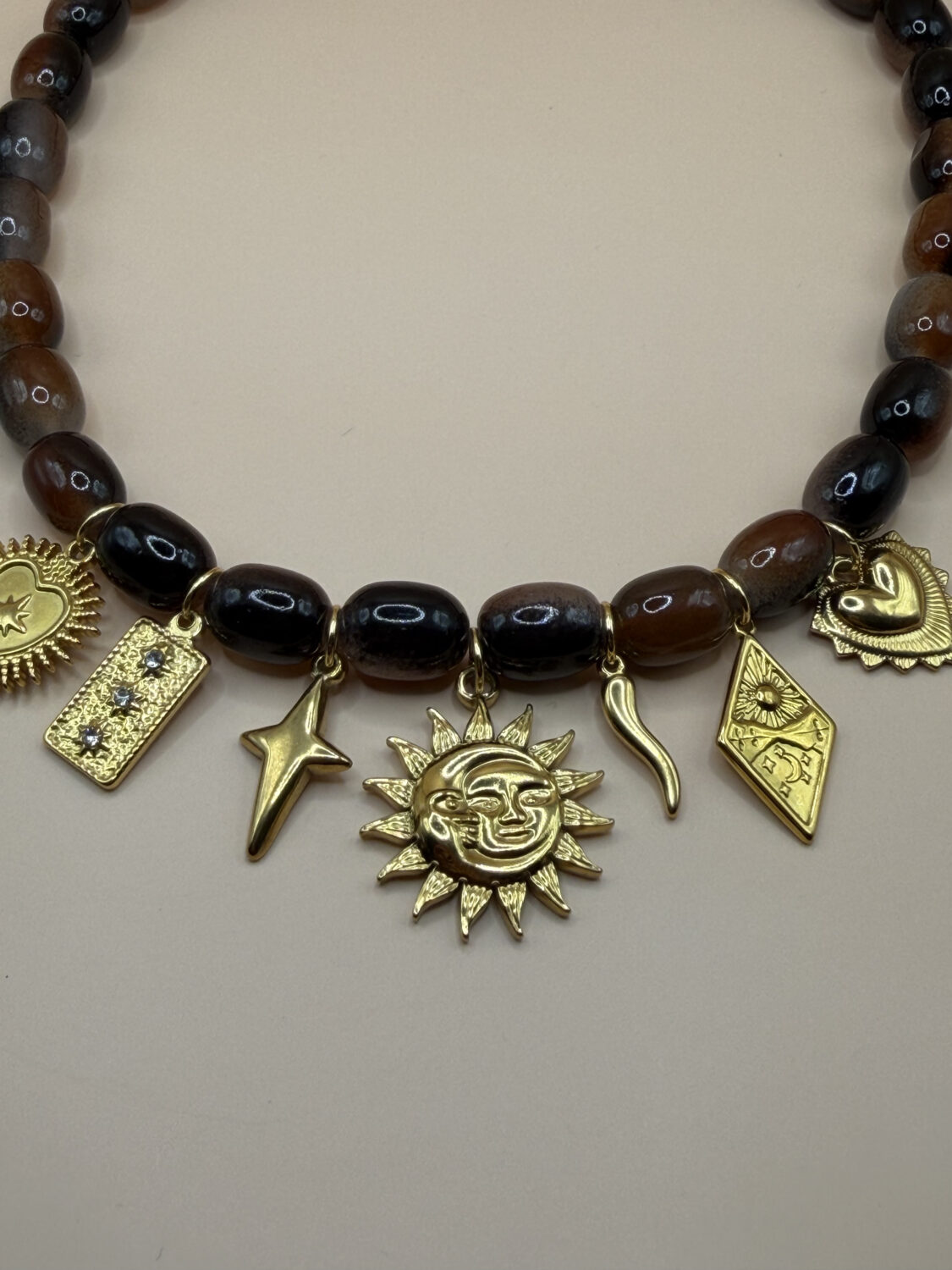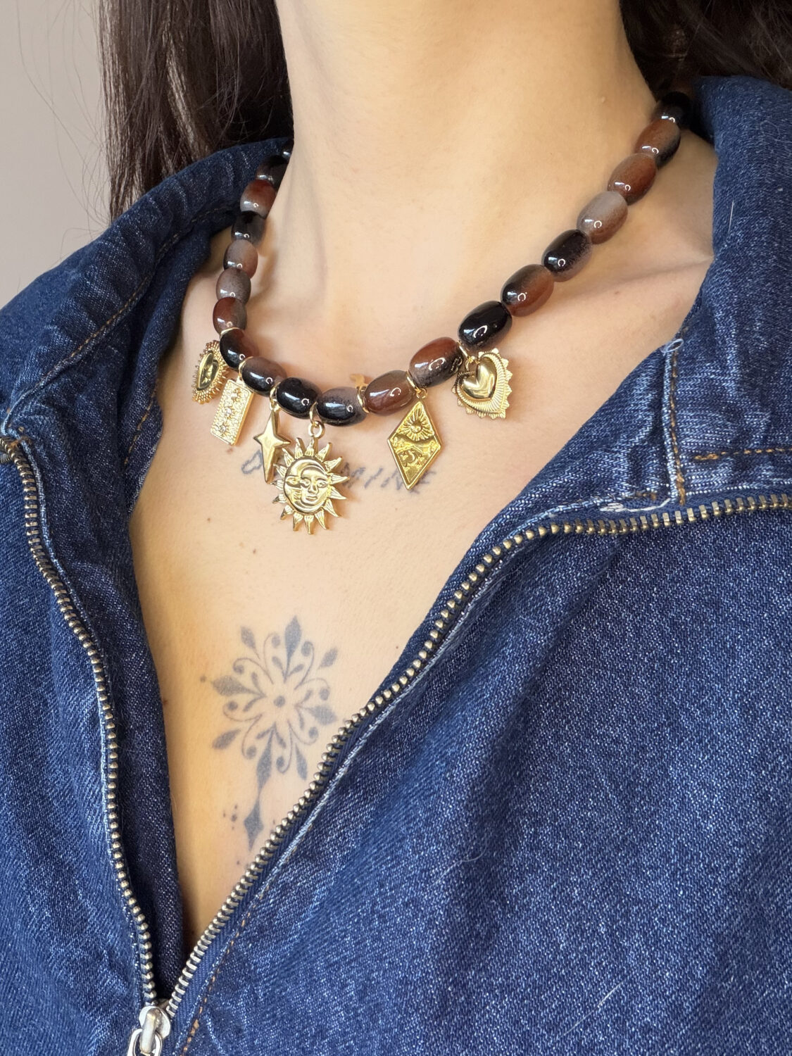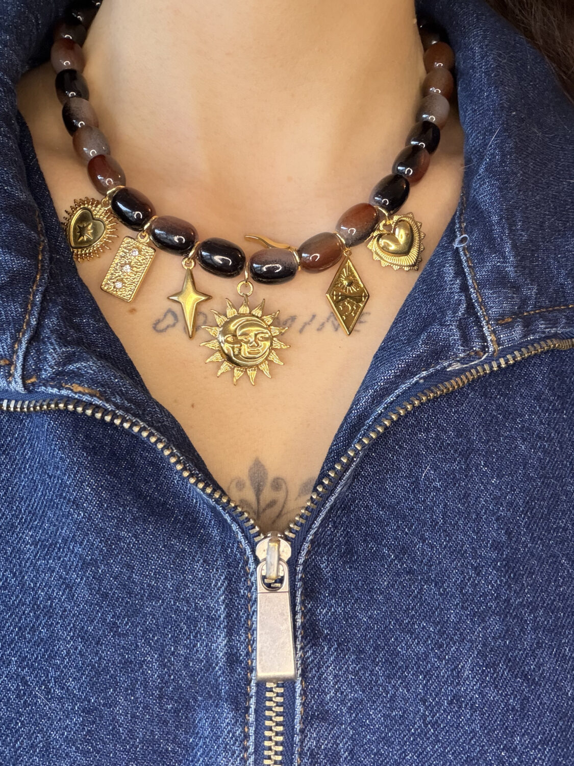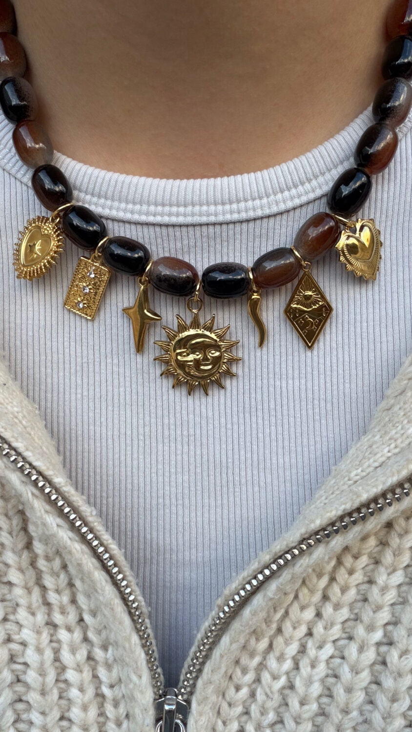 Affirme ton style avec ce collier en perles de verres bicolorées marron et noir, les couleurs ultra tendance du moment. 7 charms en acier inoxydable doré viennent compléter ces perles pour confirmer le style imposant de ce collier “Macchiato”.