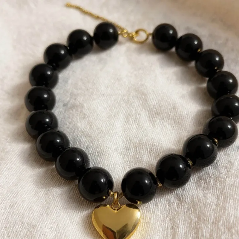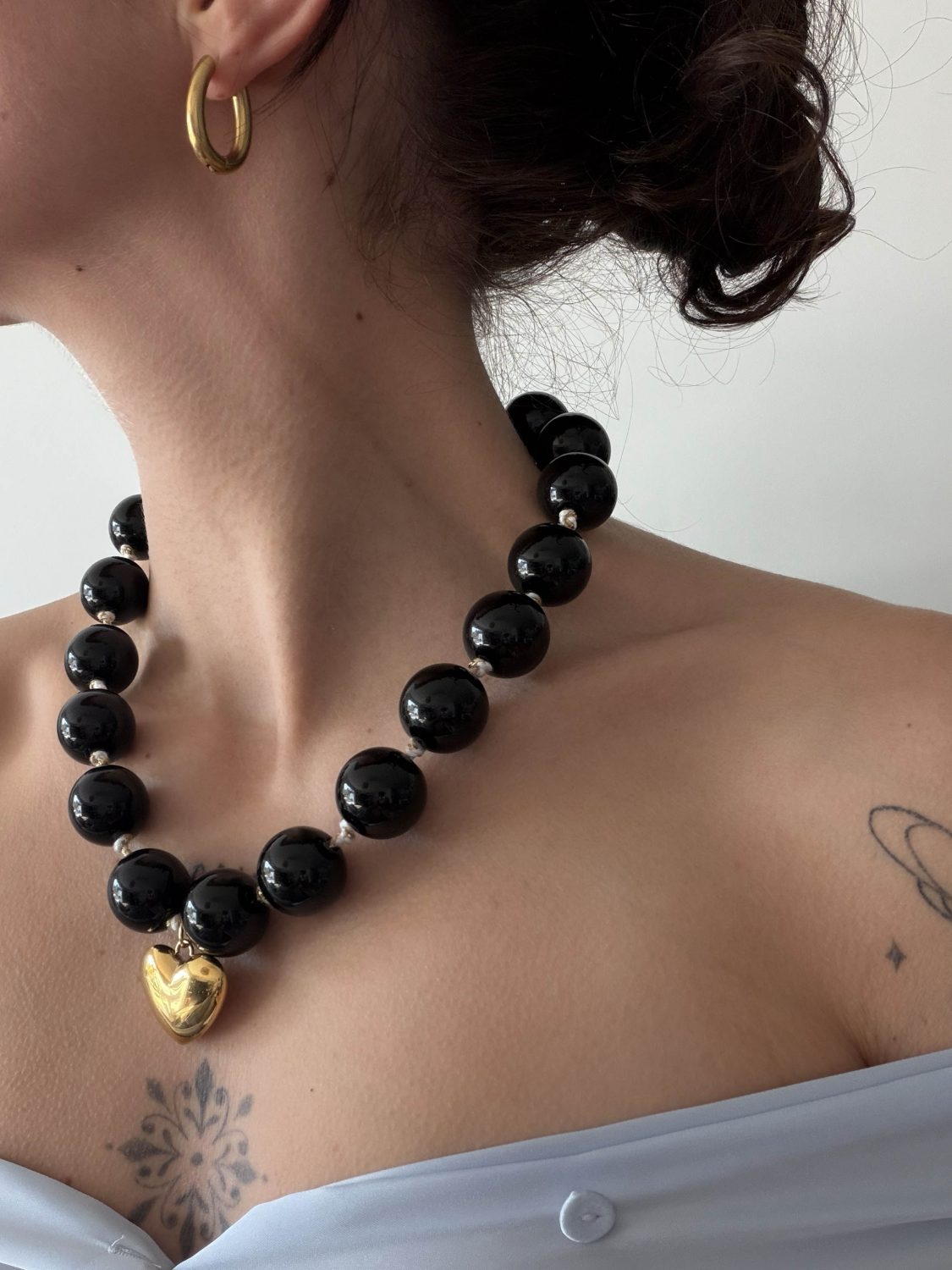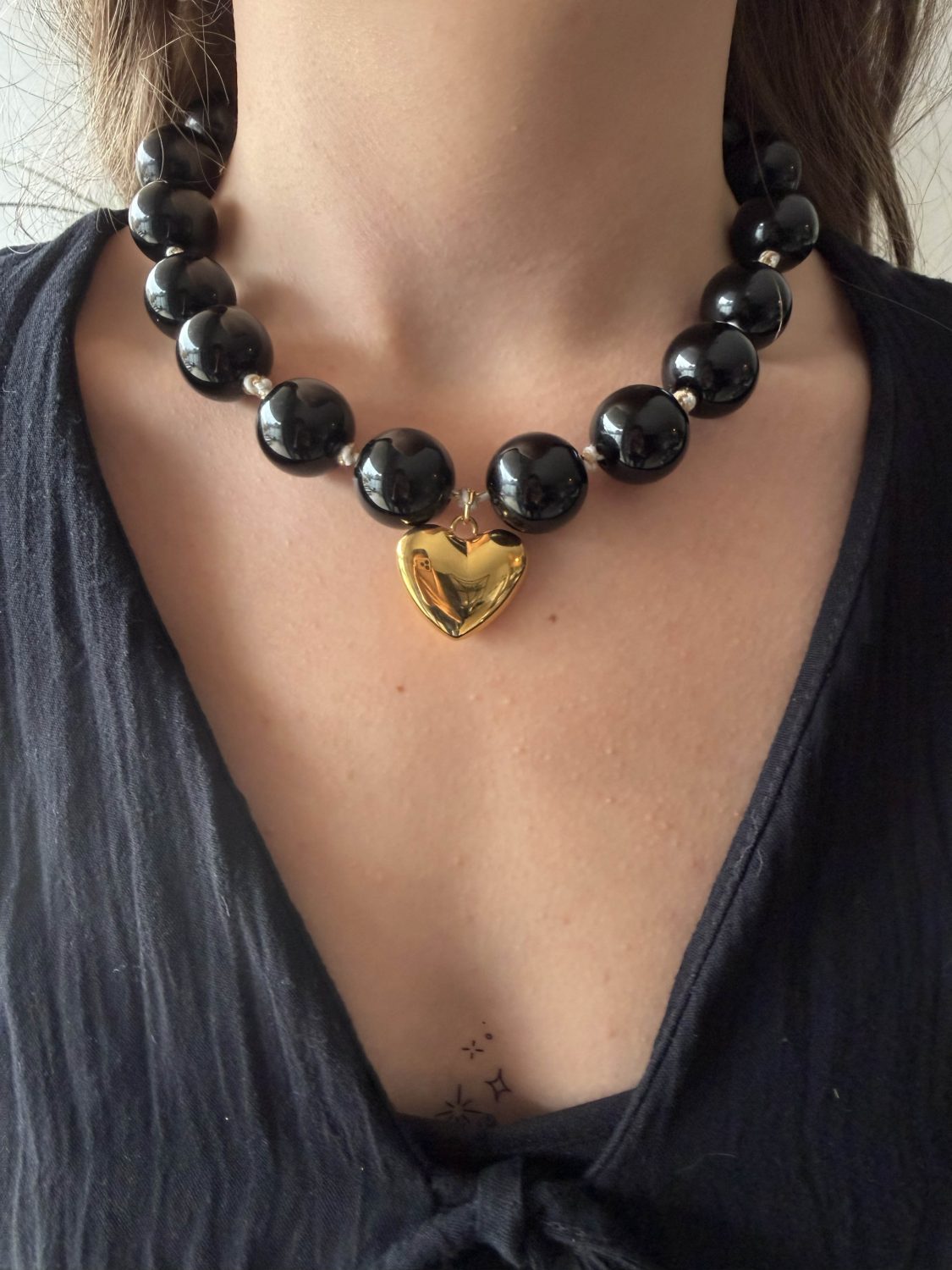 Collier Mykoko. Tissus crème et doré, noué pour séparer de grosses perles noires acryliques. C’est une statement pièce qui saura habiller vos tenues les plus simples comme les plus chics.