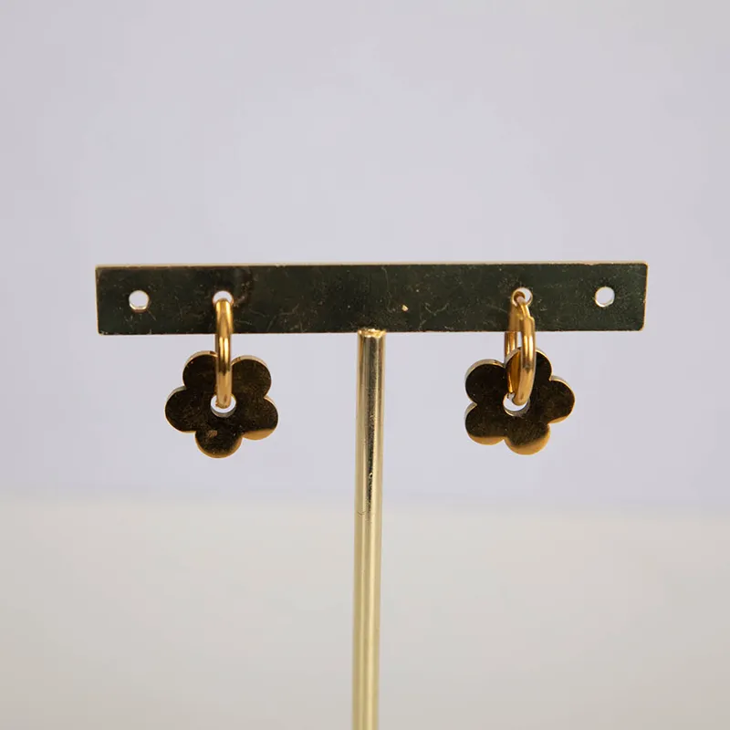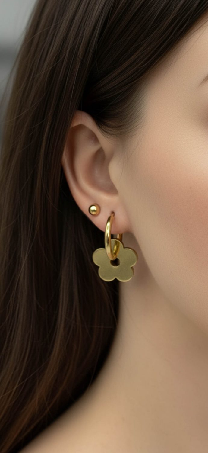 Boucles d’oreilles anneaux Quentin en acier inoxydable. Charms interchangeables, vous pouvez porter les anneaux sans ou avec la fleur, mais également avec d’autres charms à retrouver à l’unité dans l’onglet “bar à charms”.